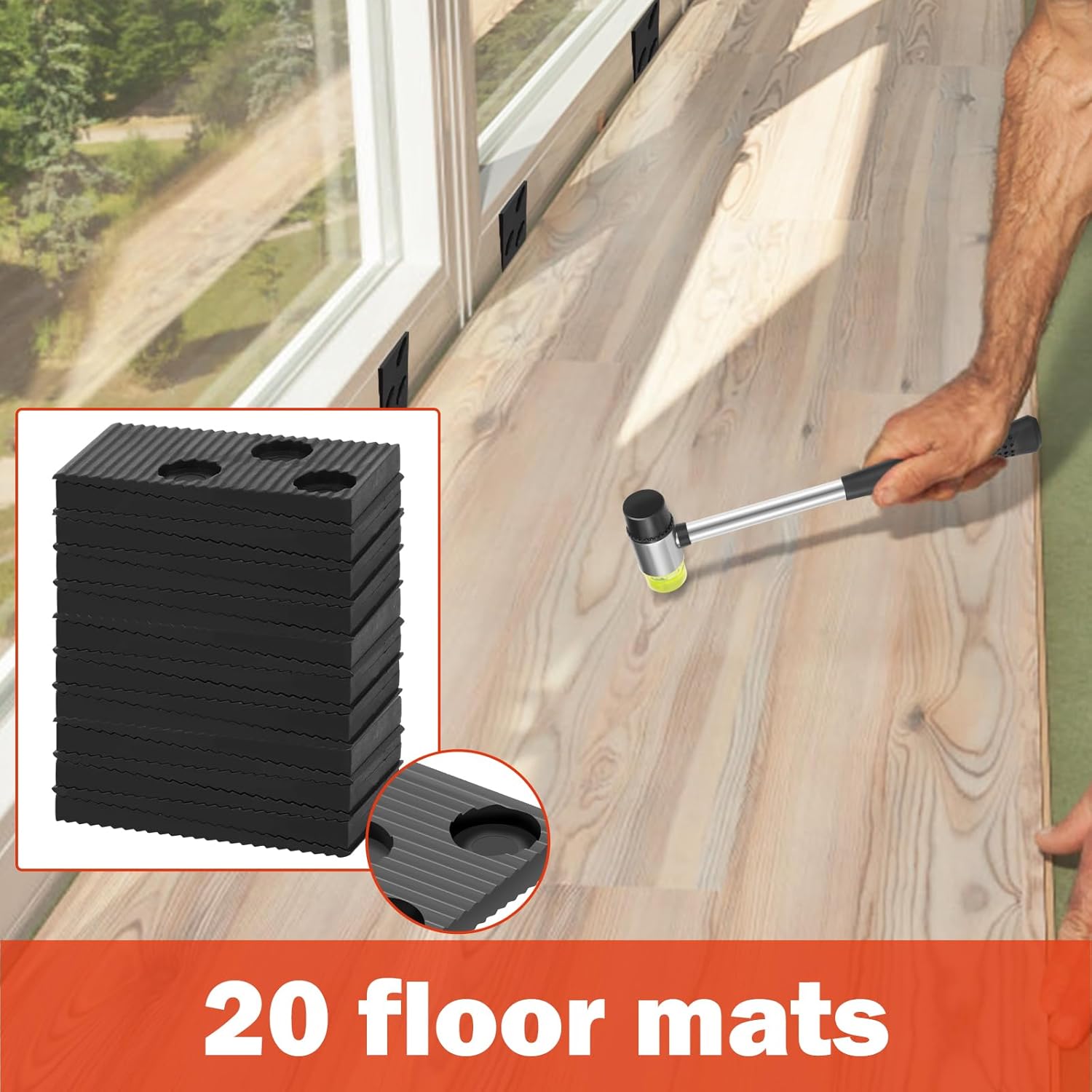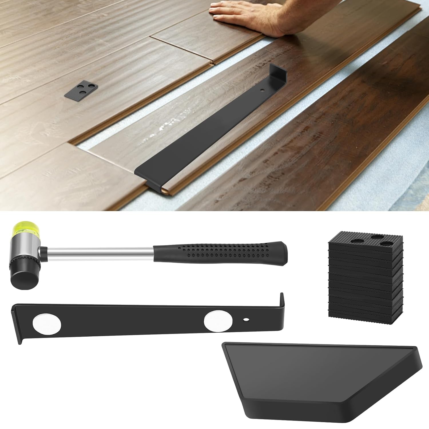 Parts List:1 x Pull Bar1 x Tapping Block1 x Hammer20 x SpacerDescription: This wood floor installation kit contains the essentials you need, making your installation more convenient and easier. It is a must have for DIY or professional use. Key Feature: You Will Receive: You will receive 1 pull bar, 1 tapping block, 1 double faced hammer and 20 pieces spacers.Specification: Product Name: Wood Floor Installation KitSize: Hammer: 26x7.6cm/10.23x2.99inchPull Bar: 26.5x4.8cm/10.43x1.89inchMaterial: IronColor: BlackNote: 1.There may be slight differences between the picture and the actual color of the commodity. We will try our best to show you the exact color.2.Please allow slight dimension difference due to manual measurement.