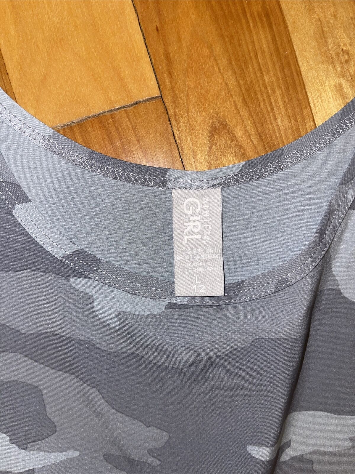 This Athleta Girl Grey Camo On The Go Shorts Romper is perfect for any active or casual occasion. The one-piece romper in size Large 12 features a stylish camouflage pattern in gray color, made of a comfortable spandex and polyester blend knit fabric. The outfit includes shorts and is perfect for girls who want to stay colorful and fashionable while on the go. The romper is in like-new condition and has never been worn before.
