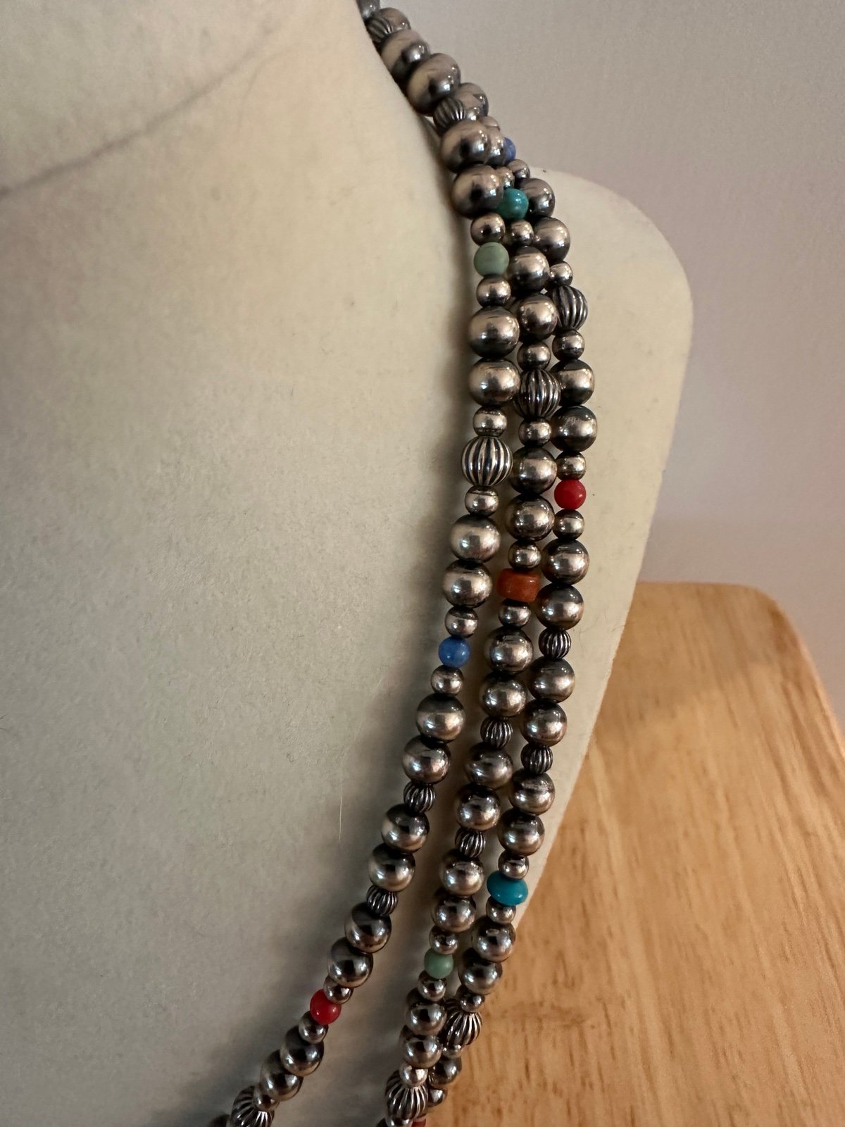 It is silver beads with oxidized and then about every 10 silver beads there is a lapis, turquoise or coral bead.