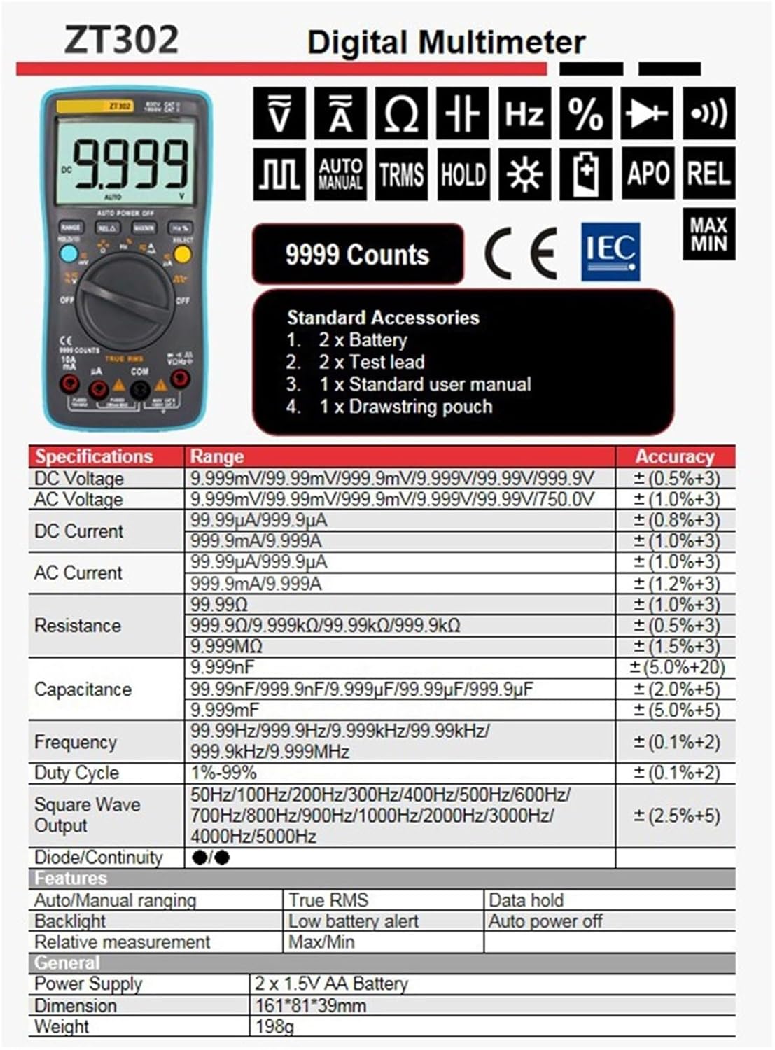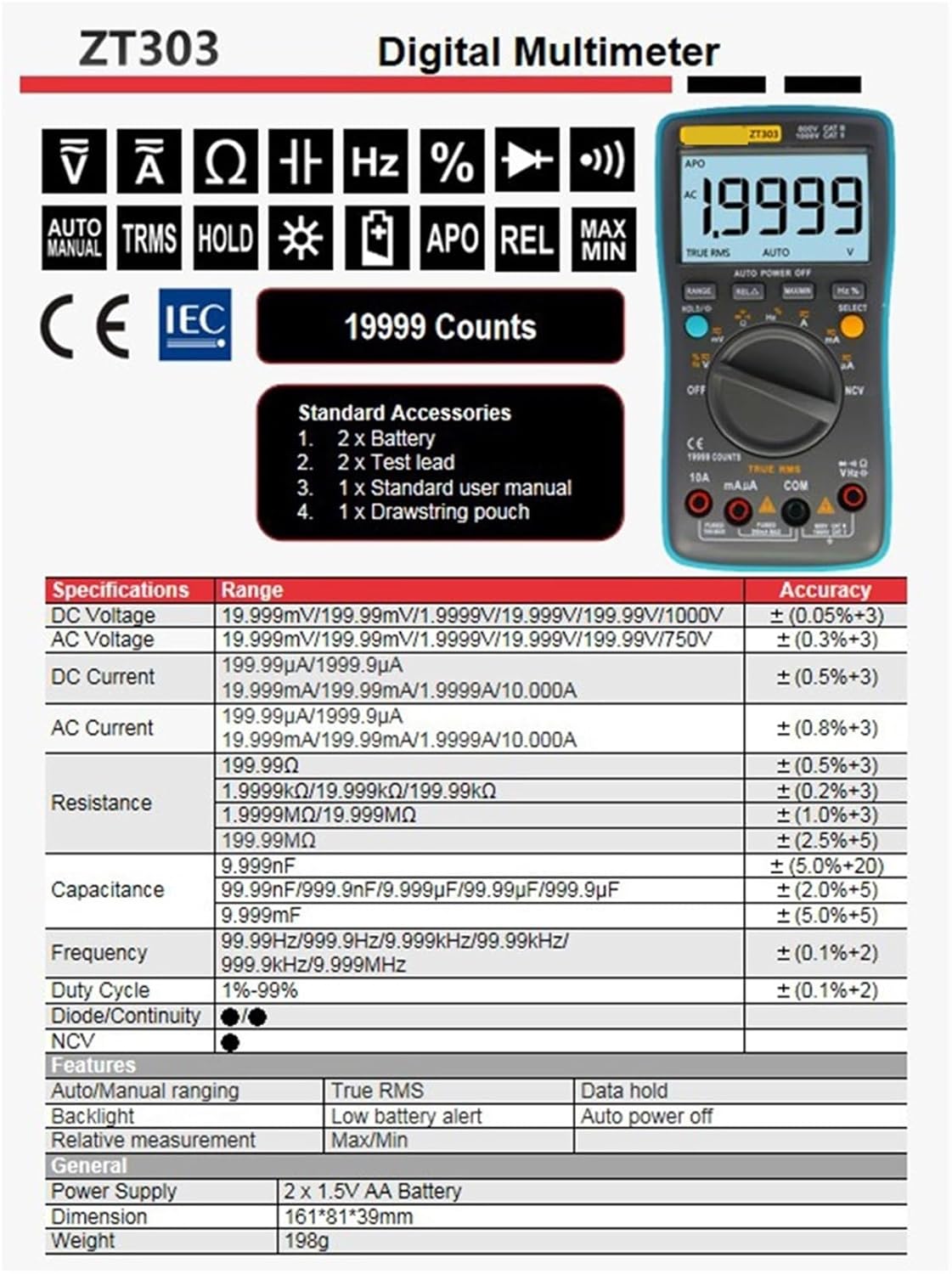 Multi TestersZT301: 8000 CountsZT302: 9999 CountsZT303: 19999 CountsNot included Batteries because the customs inspection !==========Battery Included : YesIs Smart Device : NoOperating Mode : Auto RangeMeasuring Capacitance Range : 0nF/100nF/1000nF/10uF/100uF/1000uFOperating Temperature : 0 - 40 Measuring Resistance Range : 80MΩ / 9.999MΩ / 199.99MΩCertification : DIY Supplies : ElectricalModel Number : ZT301 / ZT302 / ZT303Measuring Inductance Range : 600/6k/600k/6M/60MDimensions : 161*81*39mmDC Current : 60mA/600mA/6A/10AAC Current : 60mA/600mA/6A/10ADC Voltage : 60mV/600mV/6V/60V/600V/1000VDisplay Type : Digital DisplayAC Voltage : 60mV/600mV/6V/60V/600V/750VBattery: : 1.5V AA*2(Not included)ZT 301 Maximum display: : 8000 CountsZT 302 Maximum display: : 9999CountsZT 303 Maximum display: : 19999 CountsTure RMS: : YESTemperature : YESTure RMS : YESFrequency : YESDiode Test : YESContinuity : YESBacklight : YESData Hold : YESResistance : YESDuty cycle : YESAutomatic shut-down : YESLow voltage indication : YESPolarity automatic recognition : YES