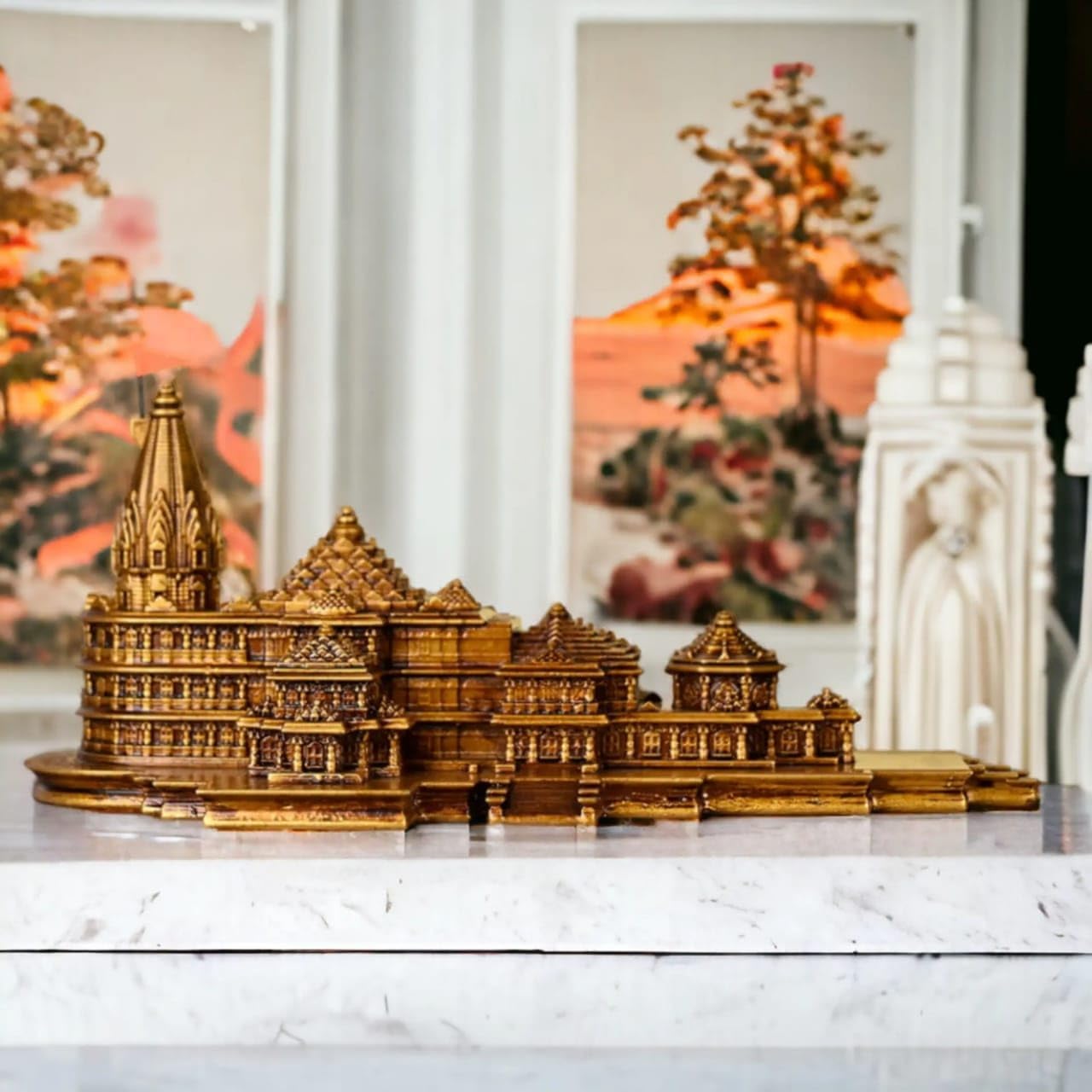 Transform your living space into a sanctuary of divine beauty with our Ram Mandir Ayodhya Model. This exquisite piece radiates opulence and spiritual significance. Standing at a majestic 6.7 inches, it captures the grandeur of Shri Ram Mandir Ayodhya, making it a focal point for your home decor. Crafted with meticulous attention to detail, this model symbolizes the rich cultural and spiritual heritage of Ayodhya. Its big size, weighing 500 grams, ensures a commanding presence, creating an atmosphere of sacred tranquility in any room. The intricate design of the Ram Mandir model reflects the architectural splendor of the revered Sri Ram Mandir, making it a tangible representation of devotion. Whether you are a collector of religious artifacts or someone seeking a unique home decor item, this model is a testament to exquisite craftsmanship and spiritual significance. The gold-coated finish adds a touch of luxury, making it an ideal centerpiece for your home. Place it in your living room, study, or any space where you want to invite blessings and positive energy. The Ayodhya Ram Mandir model serves not just as a beautiful adornment but also as a source of inspiration and reflection. Looking for a thoughtful gift? This model is a perfect choice. Surprise your loved ones with a piece of Ayodhya's pride, a tangible connection to the sacred Ram Temple. As a home decor gift, it conveys both elegance and spiritual depth, making it a meaningful present for various occasions. Embrace the essence of Ayodhya Ram Mandir in your home with this extraordinary model. Its presence will not only enhance your decor but also serve as a constant reminder of the divine. Bring home the sacredness of Sri Ram Mandir Ayodhya with our meticulously crafted, gold-coated masterpiece.