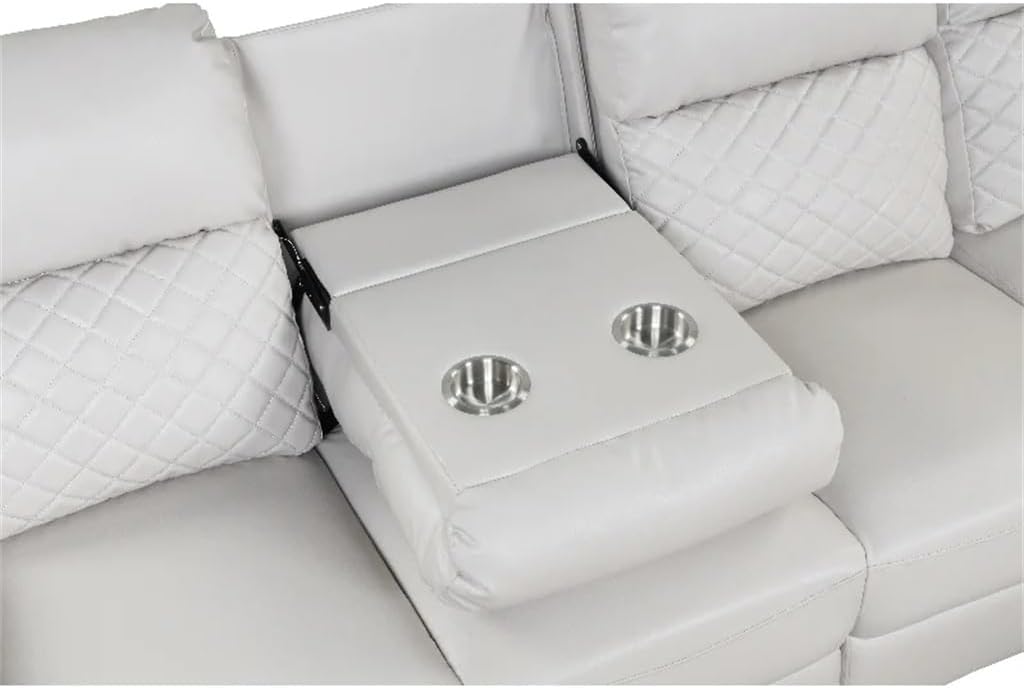 This provides excellent comfort with faux Leather upholstery, pillow-top backrest and armrests, and pocket coil spring seat cushion covered with premium foam which offers more comfort. This profoundly indulgent sectional features a manual reclining mechanism. At its center, you have a built-in console that has two cup holders. You can fold and turn it into a seat when you need to accommodate more peoples in your living room. That adds to the utility of this phenomenal piece of furniture. you get additional storage underneath the center console and side seat The interior frame is crafted from solid hardwood and the manually operated reclining mechanism in a seat offers a metal construction that's designed for years of reliable use. Ease back into the deep seating to rest your on the supportive headrest. Supple fabric gives your room the high-end look of leather with a spicy popa of color. You'll love how easy it is to recline in infiniteMaterial:faux LeatherSeat Construction: Pocket SpringBack Fill Material: FoamFrame Material: Solid + Manufactured WoodLeg Material: MetalSet Includes1*Sectional Sofa(no other presentation items included).Notice:1. Due to manual measurement, please allow 2-3% error, before you bid, please make sure you don't mind.2. The color may vary due to different displays, please refer to the actual product.